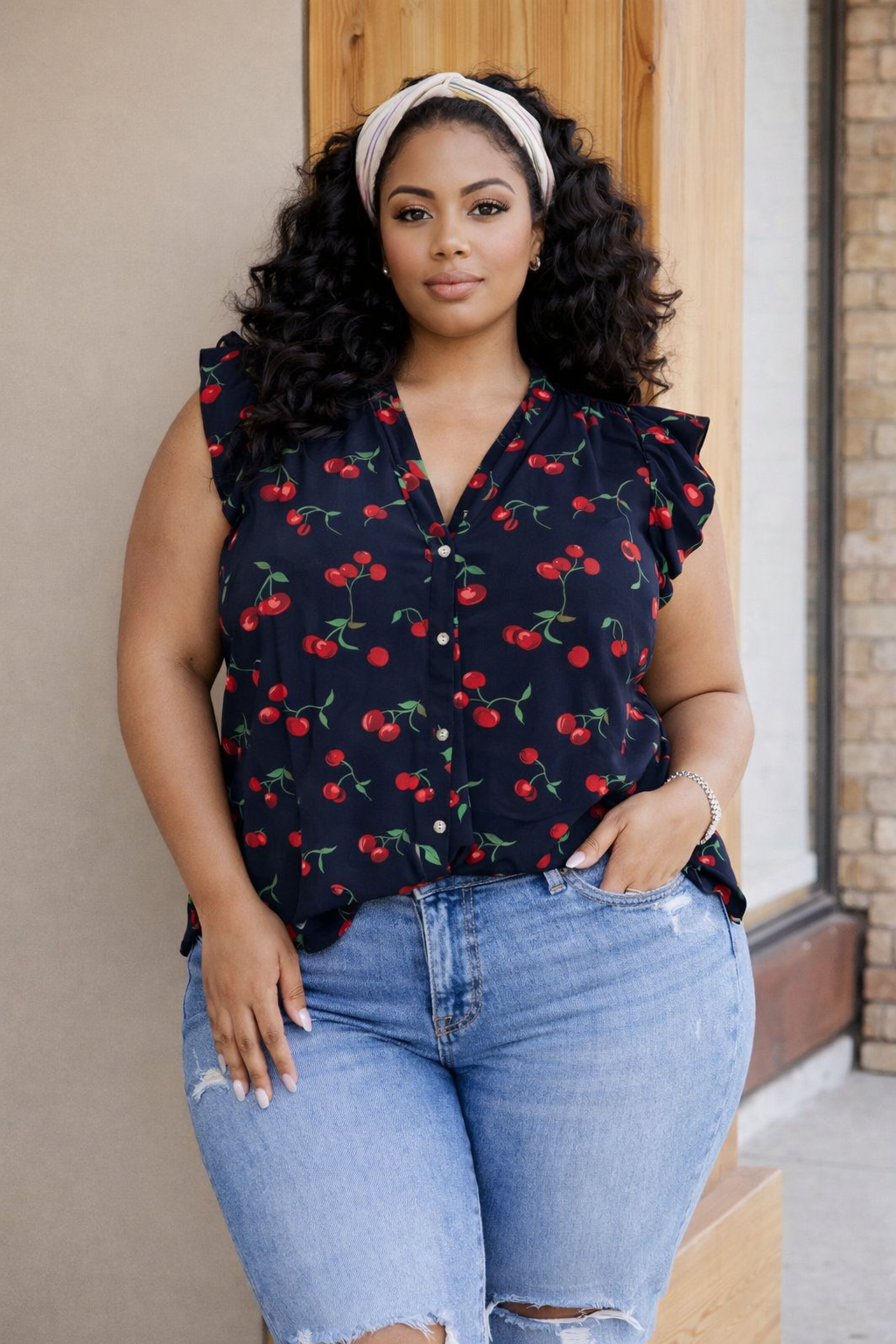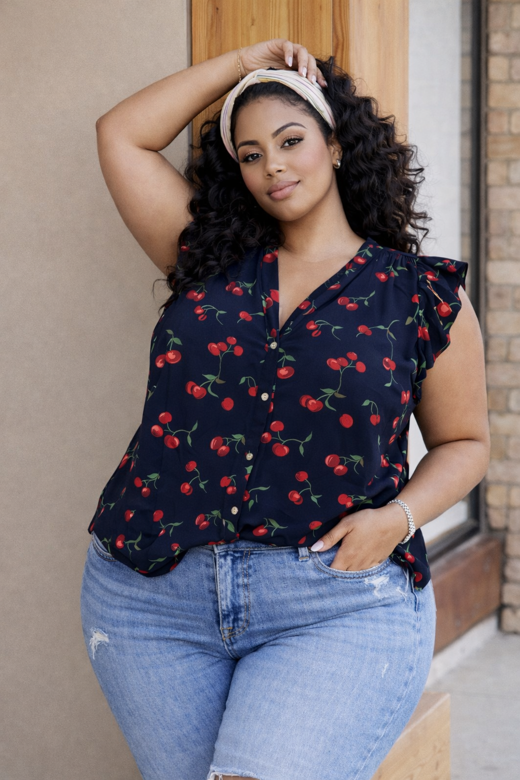 • Color: Azul marino con estampado de cerezas rojas y verdes
