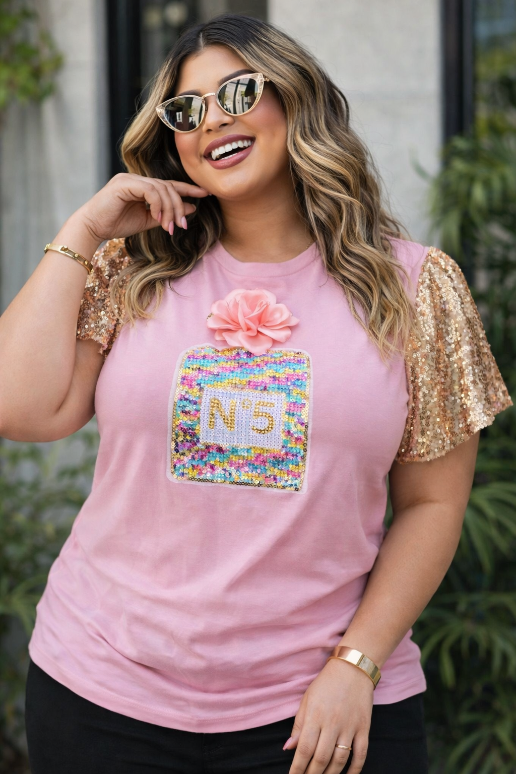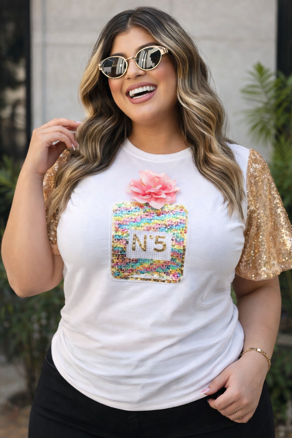 • Detalle: Parche multicolor con lentejuelas + flor decorativa